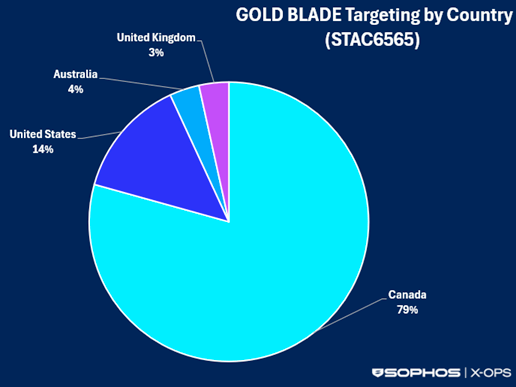 Figure: GOLD BLADE targeting by country from February 2024 through August 2025/Sophos.com